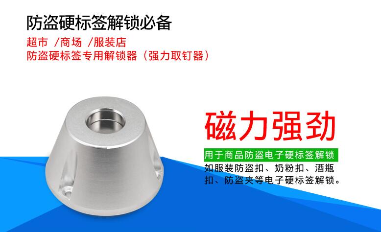 磁力強勁,用于商品防盜電子硬標簽解鎖,如服裝防盜扣、奶粉扣、酒瓶扣、防盜夾等電子硬標簽解鎖。