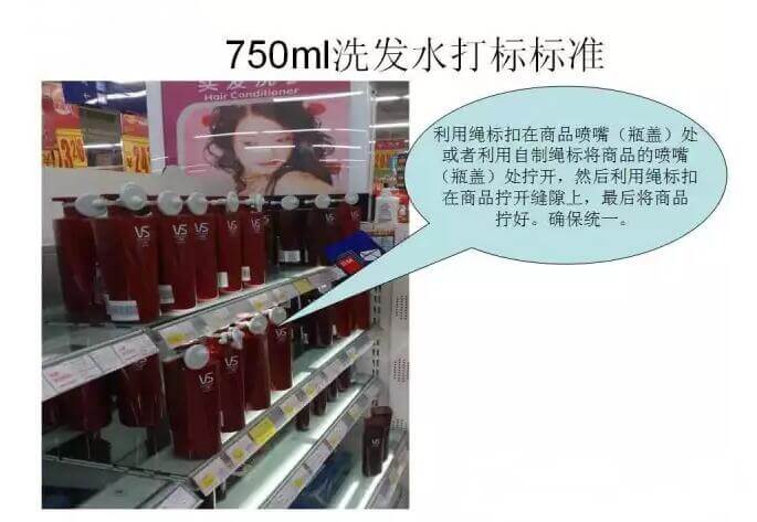 利用繩標(biāo)扣在商品噴嘴(瓶蓋)處或者利用自制繩標(biāo)將商品的噴嘴(瓶蓋)除擰開,然后利用繩標(biāo)扣在商品擰開縫隙上,最后將商品擰好。確保美觀統(tǒng)一。