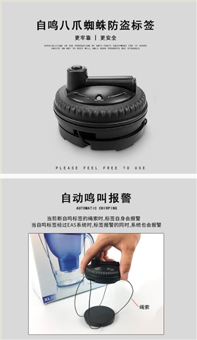 蜘蛛防盜標簽的出現使得EAS的防盜水平進入了更高的層次。除了與普通硬標簽防盜報警功能,它也有自己的斷線自鳴報警的功能,它可以迅速吸引店員的注意,從而減少盜竊概率,并用繩子包裹可以避免損壞產品。