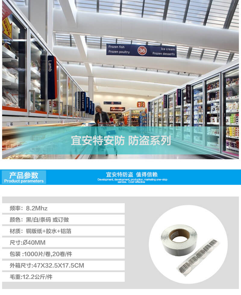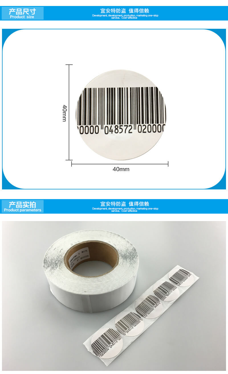 描述:薄型紙標簽,適合所有8.2MHz無線電射頻系統,適用于超市專賣店等環境中所有產品,使用范圍有,服裝吊價牌粘貼,圖書音像CD盒粘貼,洗發水,洗面奶瓶身粘貼,一系列小件紙盒包裝商品都可以使用。